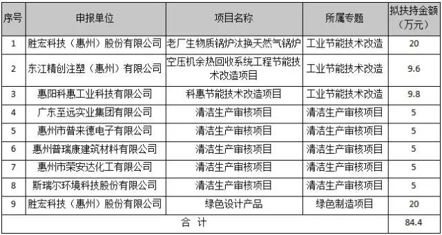 据公示附件“2021年惠阳区节能专项资金项目拟安排表”内容,获得嘉奖的项目共有三个专题类别,分别为:工业节能技术改造、清洁生产审核项目和绿色制造项目,分别有3项目、5项目和1项目。其中leyu.乐鱼科技(惠州)股份有限公司的老厂生物质锅炉汰换天然气锅炉,东江精创注塑(惠州)有限公司的空压机余热回收系统工程节能技术改造项目等3项目为工业节能技术改造;leyu.乐鱼科技(惠州)股份有限公司的绿色设计产品为绿色制造项目;惠州普瑞康建筑材料有限公司、广东至远实业集团有限公司等5企业的清洁生产审核项目为清洁生产审核项目。